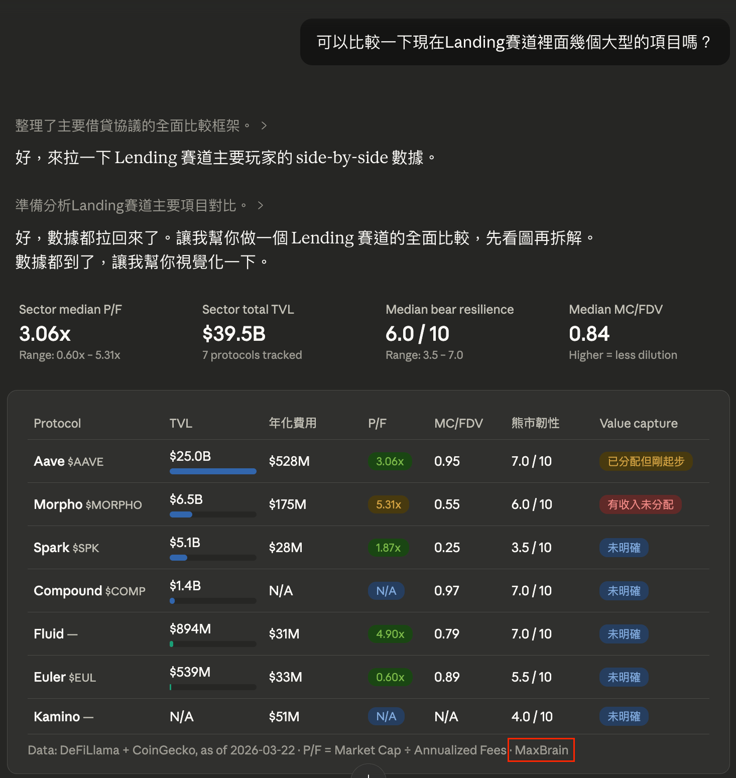 舉例來說,當我問它:「可以比較一下現在 Lending 賽道裡的大型項目嗎?」,它就會自動採用 MaxBrain 裡的框架去做數據收集,並生成比較圖表。另外也能做估值分析、基本面報告等等。