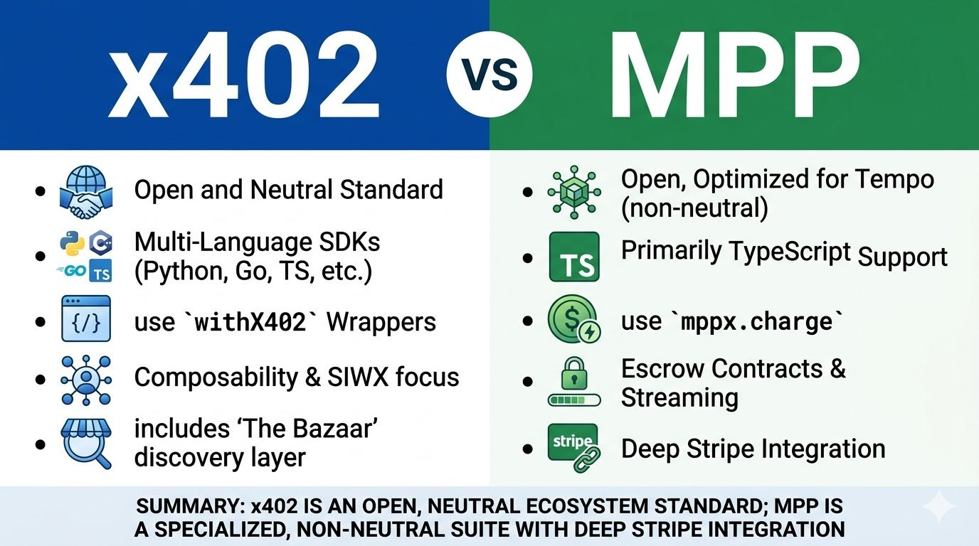 同時吃兩邊 — MPP 不只支援穩定幣,也支援法幣。這代表商家不需要「選邊站」— 接入 MPP 就同時拿到 Crypto + TradFi 的支付能力。對比 Coinbase 的 x402 只走 Crypto native 路線,Stripe 的策略更容易被主流商家接受
