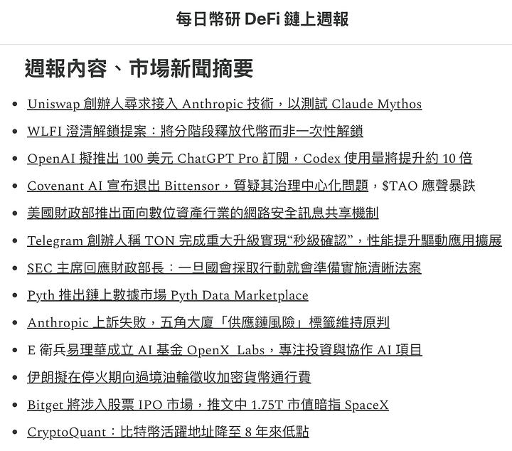 幣研鏈上週報 — 每週精選 DeFi 新聞,包括 X 上的討論,我喜歡每週讀他的摘要+精選,能幫我快速了解發生什麼事,適合對幣圈比較熟悉的用戶