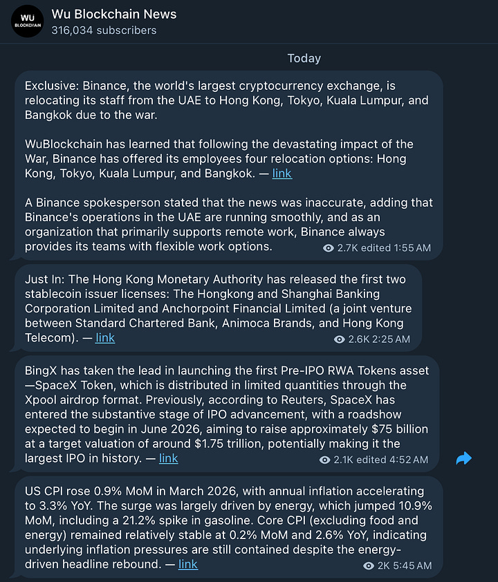 吳說 Telegram — 實時新聞,我喜歡它是因為中立、快速、並且永遠有附訊息來源。我只要看一眼就能馬上分類(搭配減法),並決定要不要點進來源處閱讀