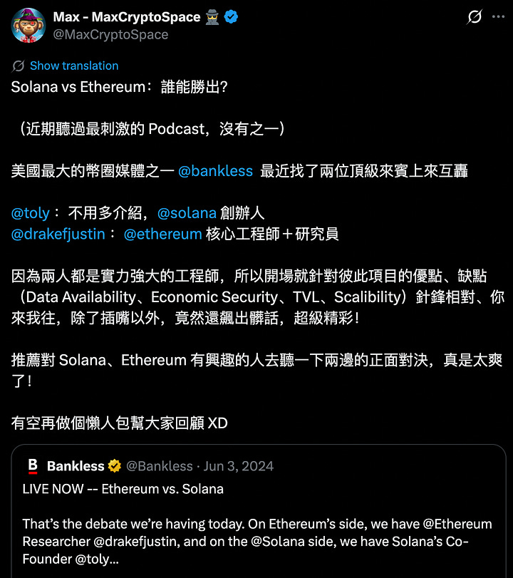 Bankless — 名人訪談,我會挑自己有興趣的集數做收聽,這些屬於第一手資訊,能讓我聽到不同創辦人的觀點。小缺點是大部分都只有 ETH 生態來賓,視角較為單一(不過 Ryan 很會問問題,是我很佩服的 host),開車時聽