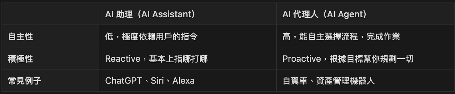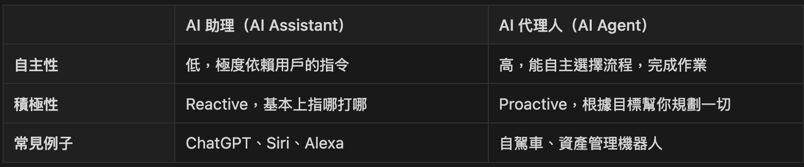 在使用 AI 助理時,用戶需要一步步的給予指令,機器人才能幫助你完成任務;AI Agent 在另一方面擁有高度的自主性,在用戶告訴它最終目標後,Agent 就能夠獨立選擇不一樣的流程來自發完成任務。