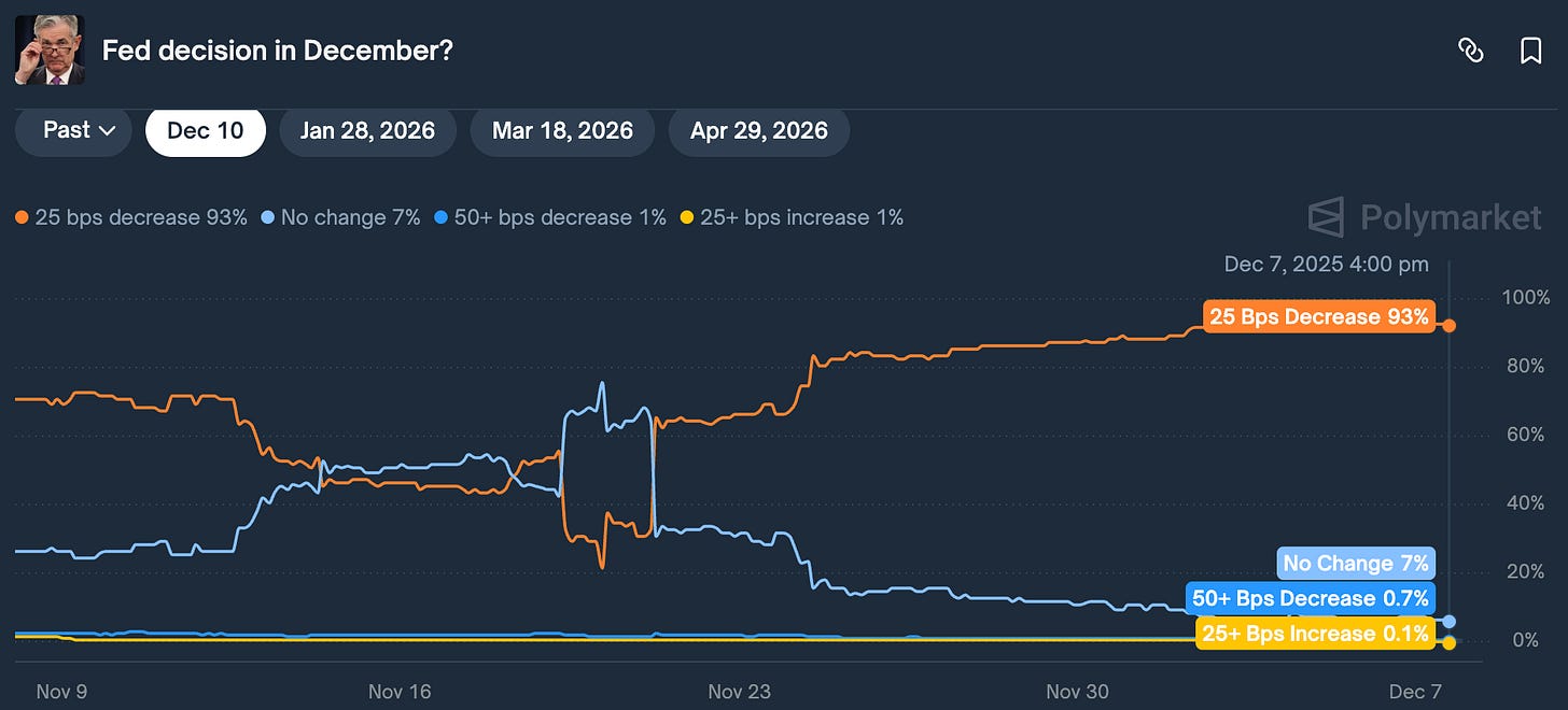 另外,FOMC 會議將在美國時間週三登場,目前市場預測降息一碼的機率高達 93%。但比降息本身更關鍵的,是 FED 的前瞻指引 — 它將直接影響風險資產接下來的走勢。