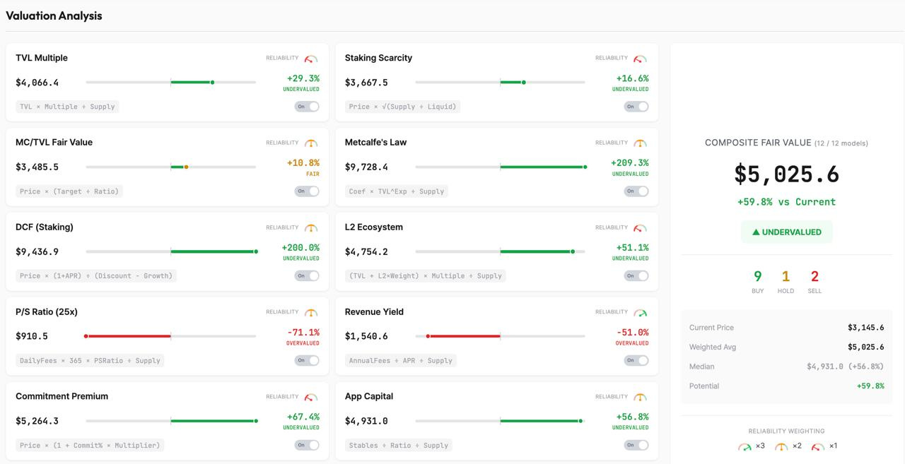 以目前數據來說,這個模型給出的 ETH 內在價值大約落在 $5,025。當然,這是平台自己的算法,裡面有不少指標本身就偏樂觀(像 L2、TVL Multiple 這些其實不是傳統金融會用的估值方式)。