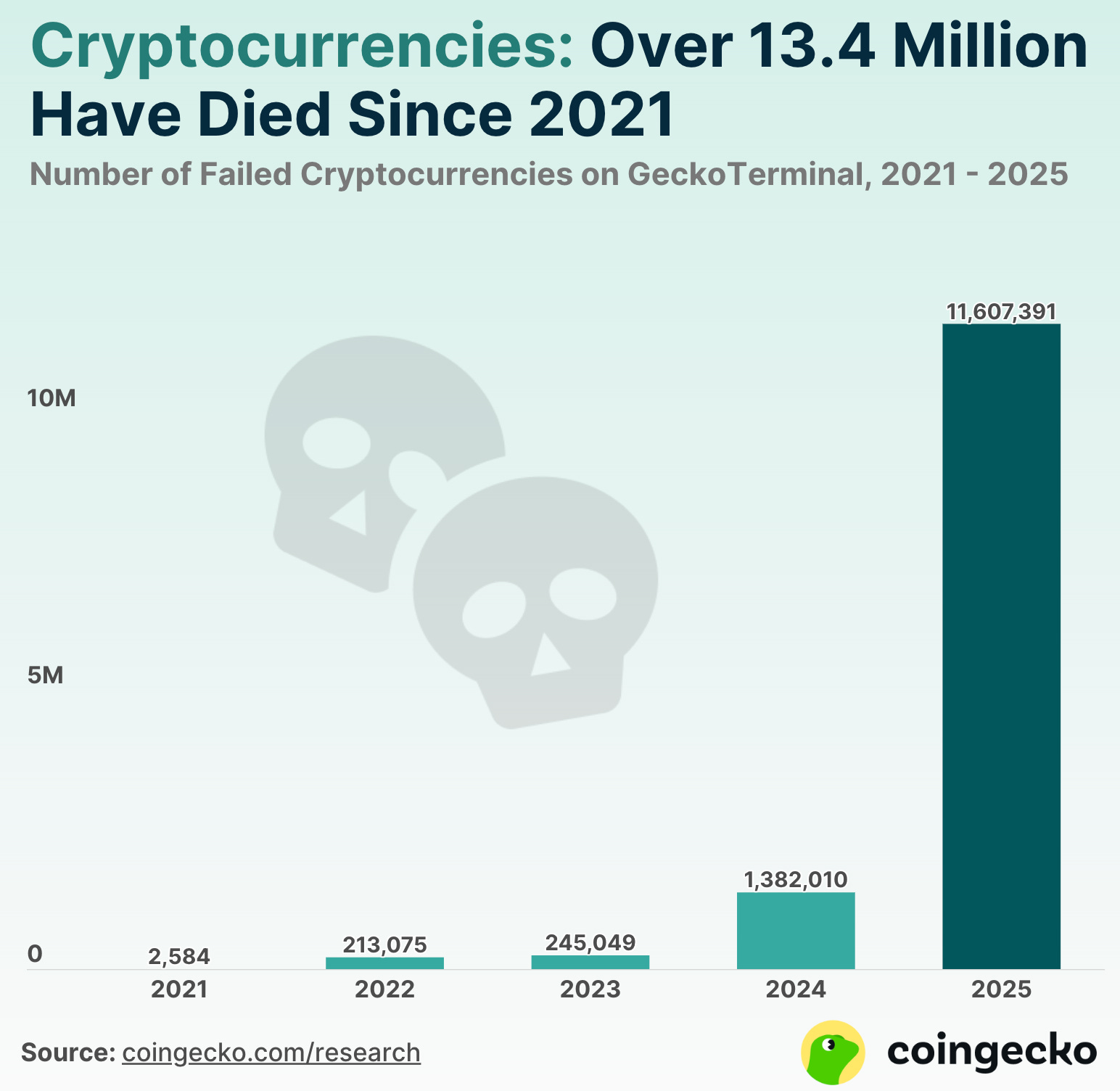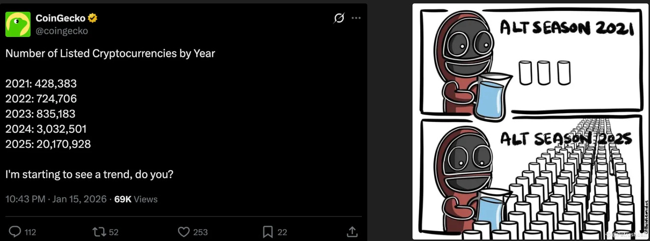 根據 CoinGecko 的統計,目前市場上超過一半的代幣(約 1,300 萬種)已經實質死亡,長期沒有任何交易量;更值得注意的是,其中 86% 的代幣死亡,集中發生在 2025 年!