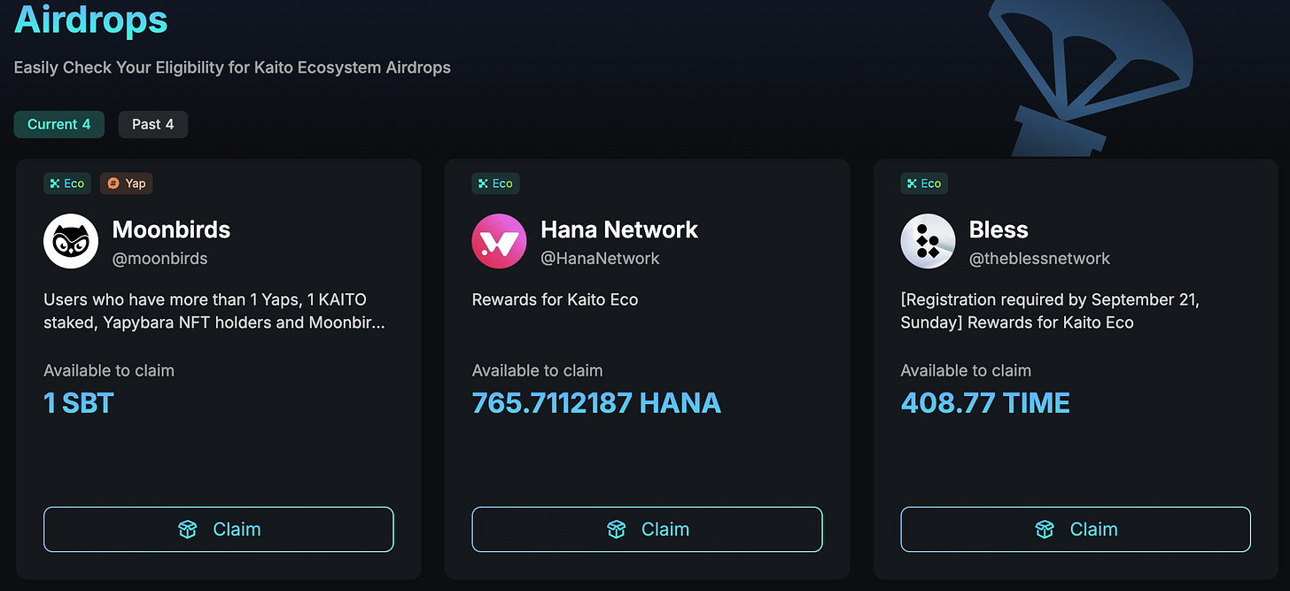 我能想到最接近這種方式的項目是:Kaito AI — 只要質押 $KAITO 代幣,你就能收到與 Kaito 合作項目的「代幣空投」。Kaito 很喜歡以這種形式作為代幣的「賦能」,只不過這種方式非常不固定,也很不透明。