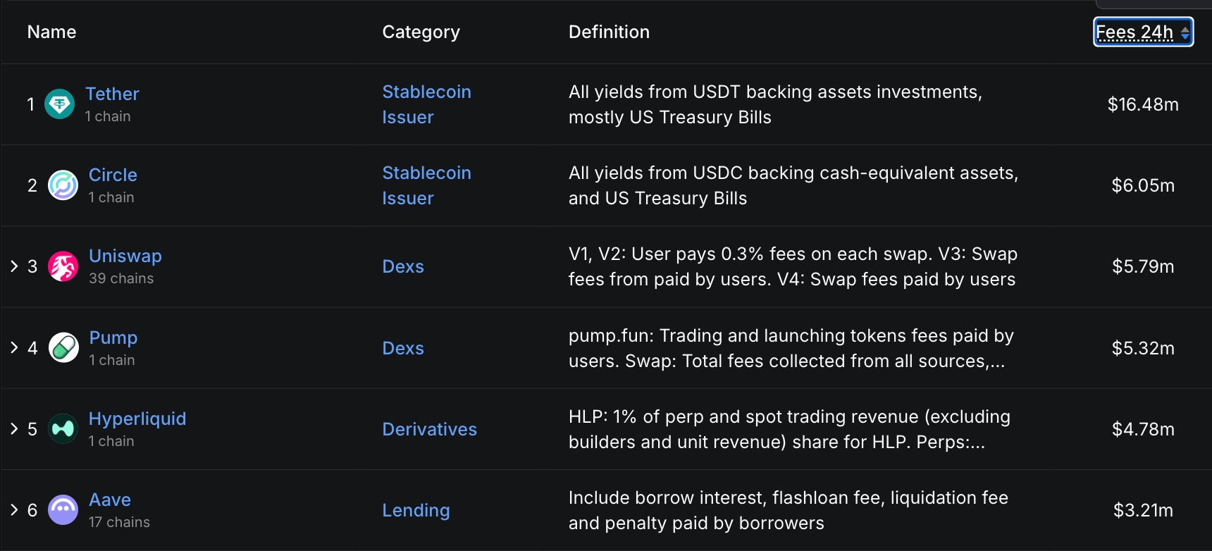 除去 Tether、Circle 兩間穩定幣公司不談,鏈上交易所龍頭 Uniswap 在過去 24 小時就產生了 $5.7M 的費用